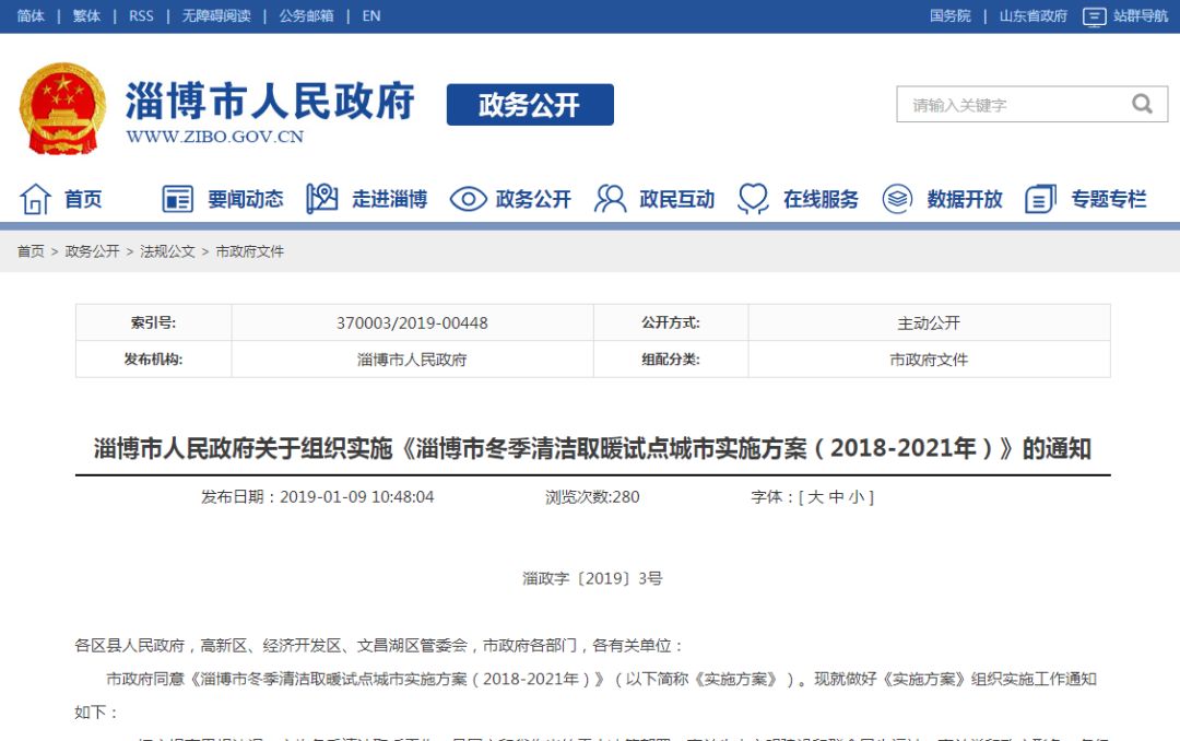 近日获悉,淄博市政府同意《淄博市冬季清洁取暖试点城市实施方案(2018-2021年)》,该《方案》明确要求加大工作力度,克服一切困难,确保2021年前全面实现清洁取暖。官网截图《方案》提出,各级各部门要以更加坚决的态度、