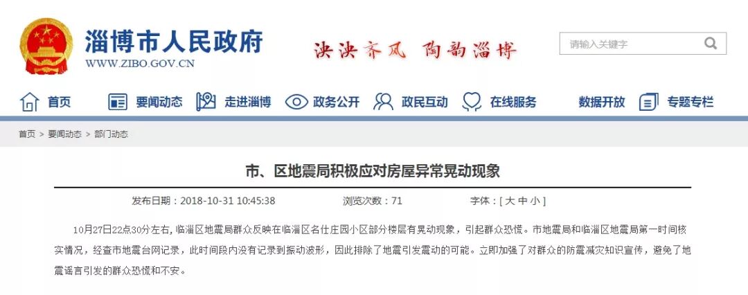 今天淄博市人民政府网站发布市、区地震局积极应对房屋异常晃动现象全文内容如下↓↓↓10月27日22点30分左右,临淄区地震局群众反映在临淄区名仕庄园小区部分楼层有晃动现象,引起群众恐慌。市地震局和临淄区地震局第一