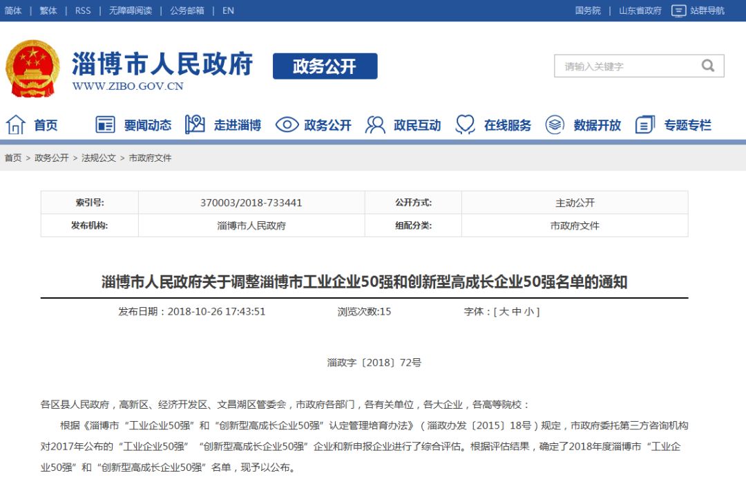 26日,淄博市人民政府印发《关于调整淄博市工业企业50强和创新型高成长企业50强名单的通知》。小编带你看看。官网截图淄博市人民政府关于调整淄博市工业企业50强和创新型高成长企业50强名单的通知淄政字〔2018〕72号各