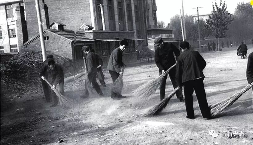 1982年,临淄区全民文明礼貌月活动中,机关干部走上街头参加劳动。
