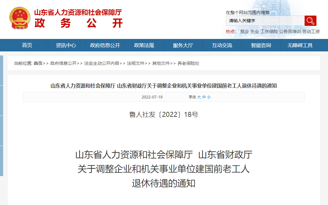 7月19日,山东省人力资源和社会保障厅,山东省财政厅发布《关于调整企业和机关事业单位新中国成立前老工人退休待遇的通知》。各市人力资源社会保障局、财政局,省直各部门、单位,各养老保险省直管企业,各中央驻鲁机关事业单