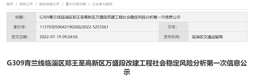7月19日临淄区交通运输局发布G309青兰线临淄区郑王至高新区万盛段改建工程社会稳定风险分析第一次信息公示按照《国家发展改革委重大固定资产投资项目社会稳定风险评估暂行办法》(发改投资〔2012〕2492号)和《关于印发