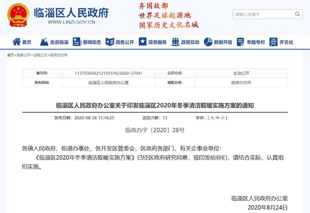 2020年8月26日,临淄人民政府网站发布《关于印发临淄区2020年冬季清洁取暖实施方案的通知》,《通知》明确对列入2020年冬季清洁取暖改造任务的用户和项目,继续按照淄博市和临淄区2017年、2018年、2019年清洁取暖实施方案