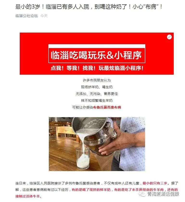 2019年12月10日,临淄公社论坛微信公众号推送的文章——《最小的3岁!临淄已有多人入院,别喝这种奶了!小心“布病”》,在短时间内获得广泛关注。有群众担心,纷纷询问临淄是不是有很多住院病人?就此问题,临淄区疾控中心做以下说