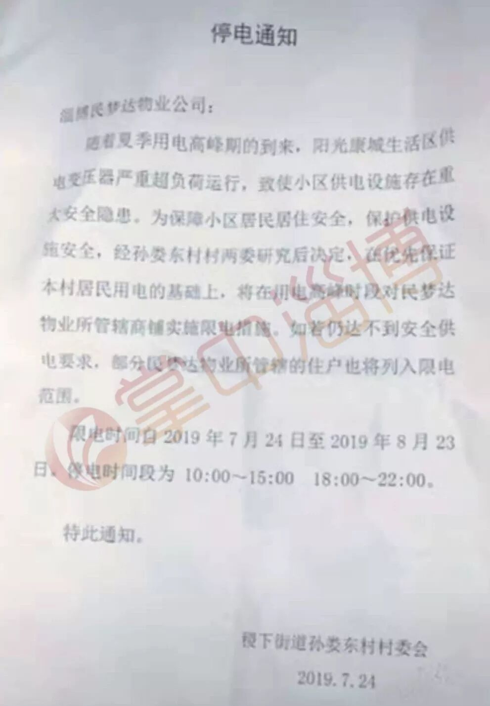 近日,有市民拨打电话反映,在高温持续的三伏天,临淄区稷下街道办孙娄东村村委会却向他们小区物业下发了停电通知。停电通知淄博民梦达物业公司:随着夏季用电高峰期的到来,阳光康城生活区供电变压器严重超负荷运行,致使小区供