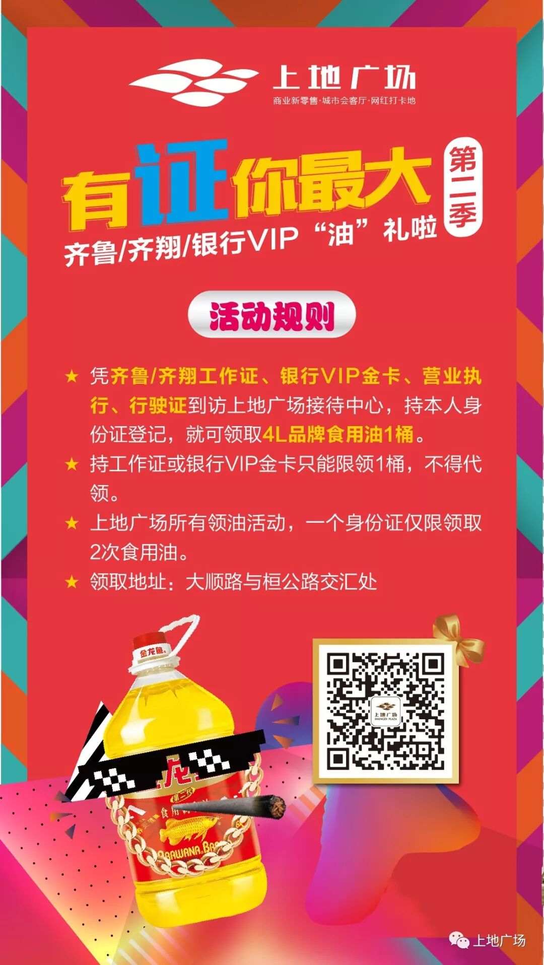 上地广场送油再升级大桶装食用油继续免费领免费领免费领~~~活动一:凭证领油凭齐鲁石化、齐翔腾达工作证、各大银行VIP金卡凭营业执行、行驶证可持本人身份证至上地广场接待中心领取4L品牌食用油~~~活动二:转发领油连续7