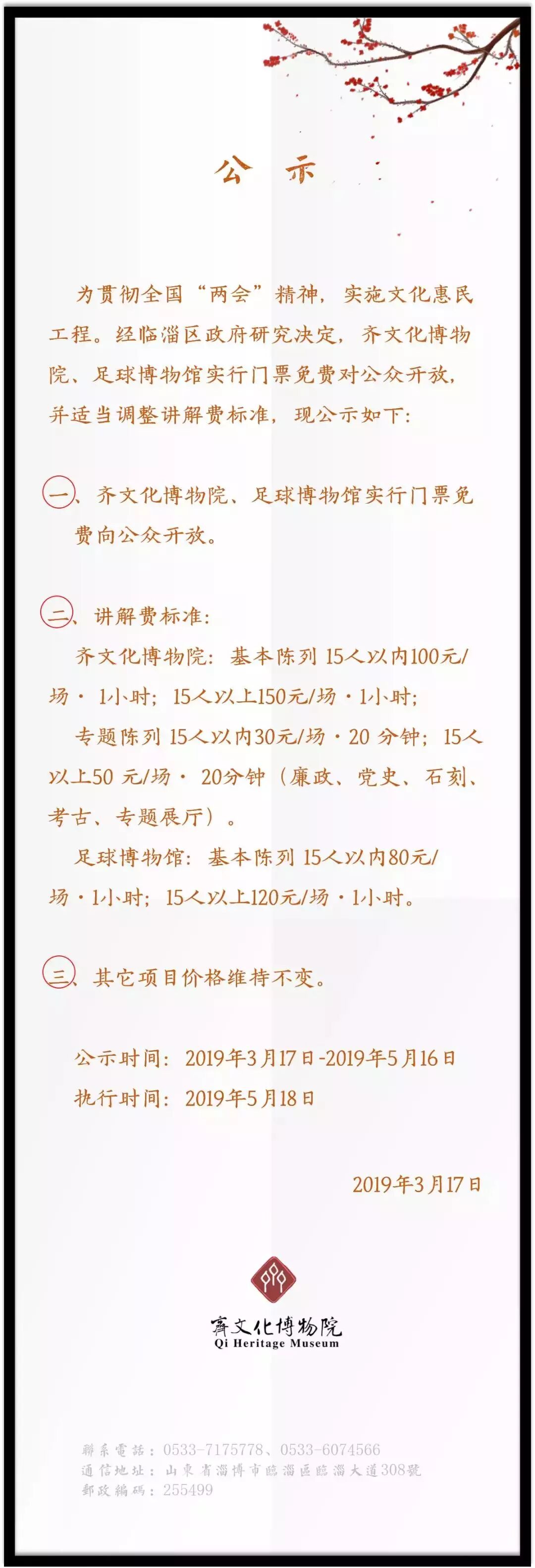 近日,齐文化博物院发布公示齐文化博物院、足球博物馆将免费对公众开放,并公布了最新调整的讲解收费标准,公示时间3月17日-5月16日,执行日期5月18日。具体公示如下↓↓↓