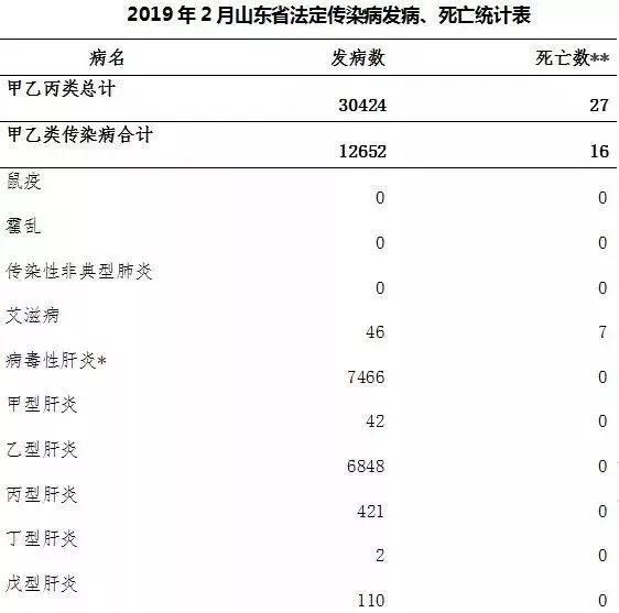 近日,山东省卫生健康委员会发布山东省2019年2月法定报告传染病疫情通报。2019年2月(2019年2月1日0时至2月28日24时),山东省无甲类传染病发病、死亡报告,共报告法定传染病30424例,死亡27人。26种乙类传染病中,传染性非典型肺