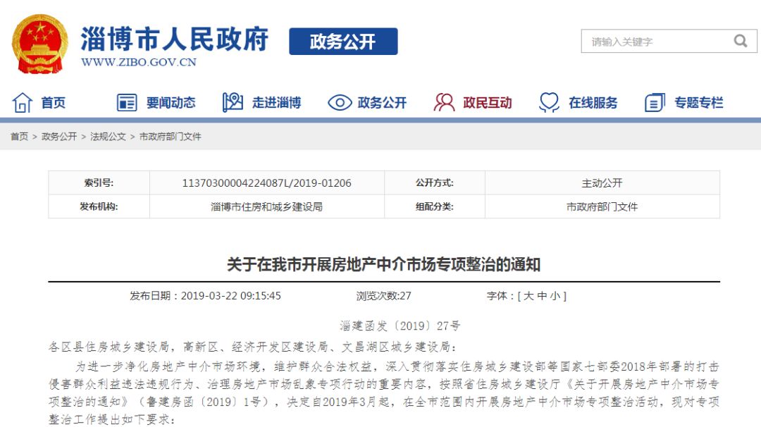 3月22日,淄博市住房和城乡建设局发布,关于开展房地产中介市场专项整治的通知。↓↓↓通知指出,自2019年3月起,在全市范围内组织开展为期半年的房地产中介市场专项整治活动。一整治重点1、发布虚假房源信息招揽业务,诱骗、