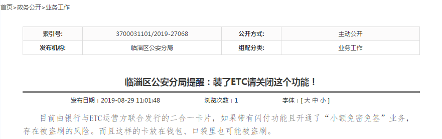 8月29日临淄区人民政府官方发布临淄区公安分局提醒:装了ETC请关闭这个功能!ETC信用卡可因“闪付”功能被盗刷经向中国银联确认,目前由银行与ETC运营方联合发行的二合一卡片,如果带有闪付功能且开通了“小额免密免签”业务