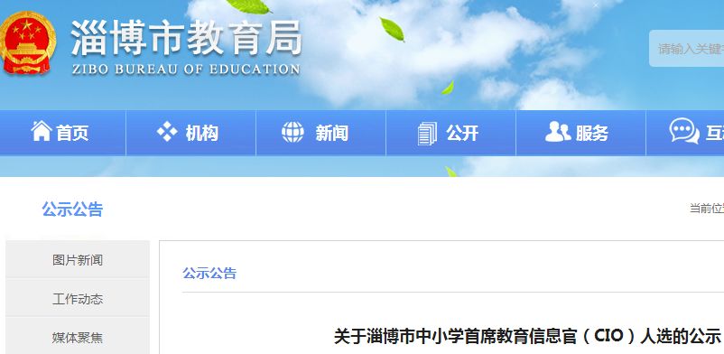 根据《淄博市第二期教育信息化三年行动计划2018—2020》和《关于推进首席教育信息官(CIO)制度建设的通知》精神,经评审并按有关程序研究,确定淄博市中小学首席教育信息官(CIO)人选20名,现予以公示。淄博市教育局2019年1月10