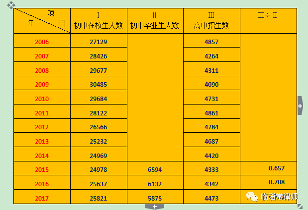 本文仅供研究参考之用,如作其他用途,一概与本人无关!2006—2017年临淄区高中招生情况大数据分析首先,由于手头的资料有限,在2006—2014年只找到高中招生人数,没有找到初中毕业生人数,如果能找到2006—2014年初中毕业生人