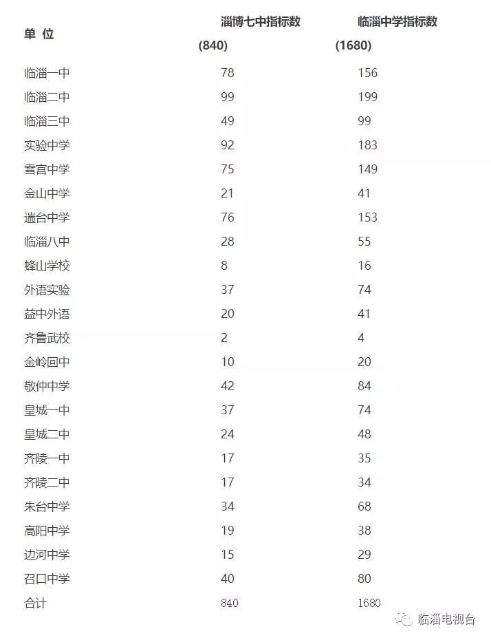 临淄区政府官网最近公布了两所高中共有2520人指标具体方案如下*02主要分配依据*各初中学校应届在籍且在该校就读的初中毕业生数和对初中学校督导评估情况*03分配方法*(一)参与指标分配的高中学校淄博市第七中学、临淄中