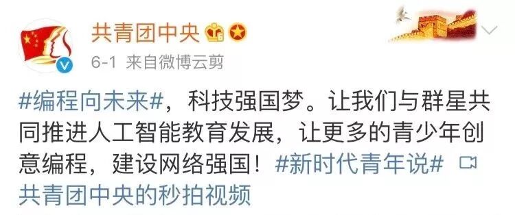 不久后,共青团中央也在微博中呼吁“编程向未来,让更多的青少年创意编程,建设网络强国”。短短几天播放量就超过200万,转发人数20万以上。