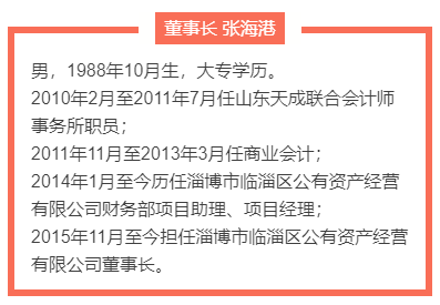 具体来看,财务岗位出身的张海港从2014年1月进入淄博临淄公有资产公司,到2015年11月肩负董事长重任,前后仅用了1年零10个月的时间。从其1988年10月的出生时间看,这位董事长上任时才刚满27岁。