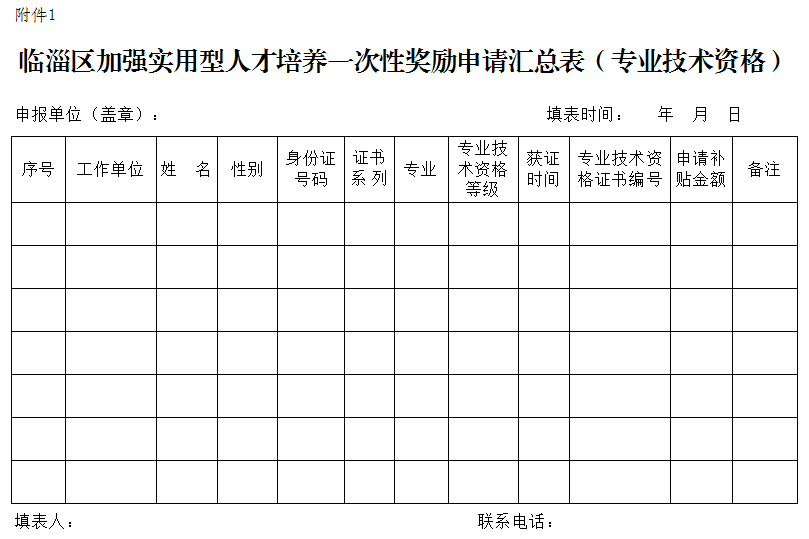3.临淄区加强实用型人才培养一次性奖励申请汇总表(专业技术资格)1份(附电子版)。