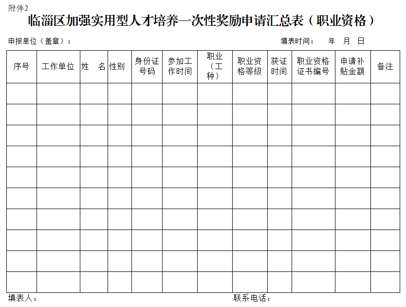 2.临淄区加强实用型人才培养一次性奖励申请汇总表(职业资格)1份(附电子版)。