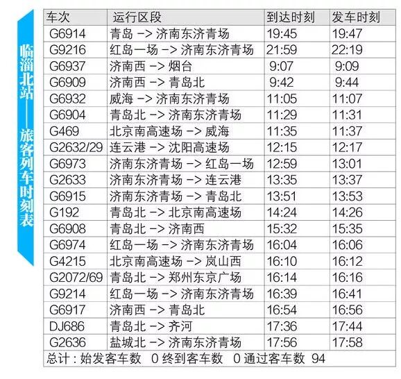 经临淄北站的列车共有19趟,由16趟日常车和3趟高峰车(由铁路部门统一调度,在客流高峰期开行)组成,列车都是停2分钟再开车。济青高铁正式通车后,所有图定列车94趟,均为“G”字头。