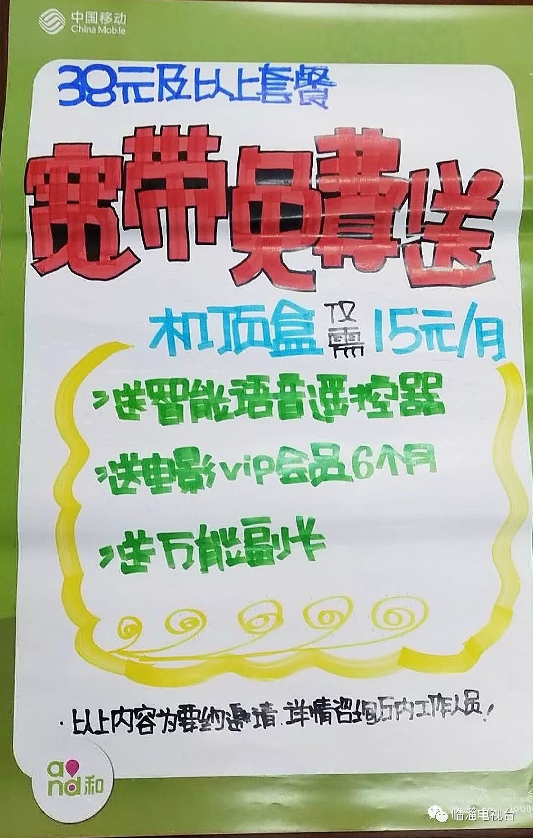 移动公司根据不同的消费人群,推出了各种宽带业务,一个是在移动公司办理不限流量套餐就可以免费使用宽带及电视业务,二是38以上的套餐即可免费享受移动百兆宽带网两年,电视每月仅需15元,另赠语音遥控器一部(限时办理)。