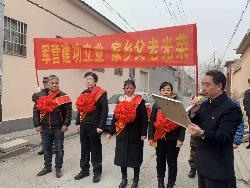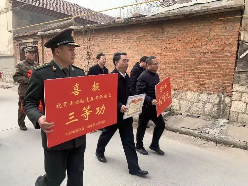 “军地联手锣鼓喧天送喜报,功臣家人披红戴花受尊崇”,1月4日上午,在临淄区凤凰镇王桥村乡亲们的见证下,区人武部、区退役军人事务局、凤凰镇人民政府的领导们为现役军人王晓的父母和叔叔、婶婶披绶带、戴红花、送上喜报和慰问金。王晓2010年参军入伍,目前在国旗护卫队服役,参军八年间先后荣获优秀士兵、优秀士官等荣誉称号,这次荣立三等功全家人倍感荣耀。