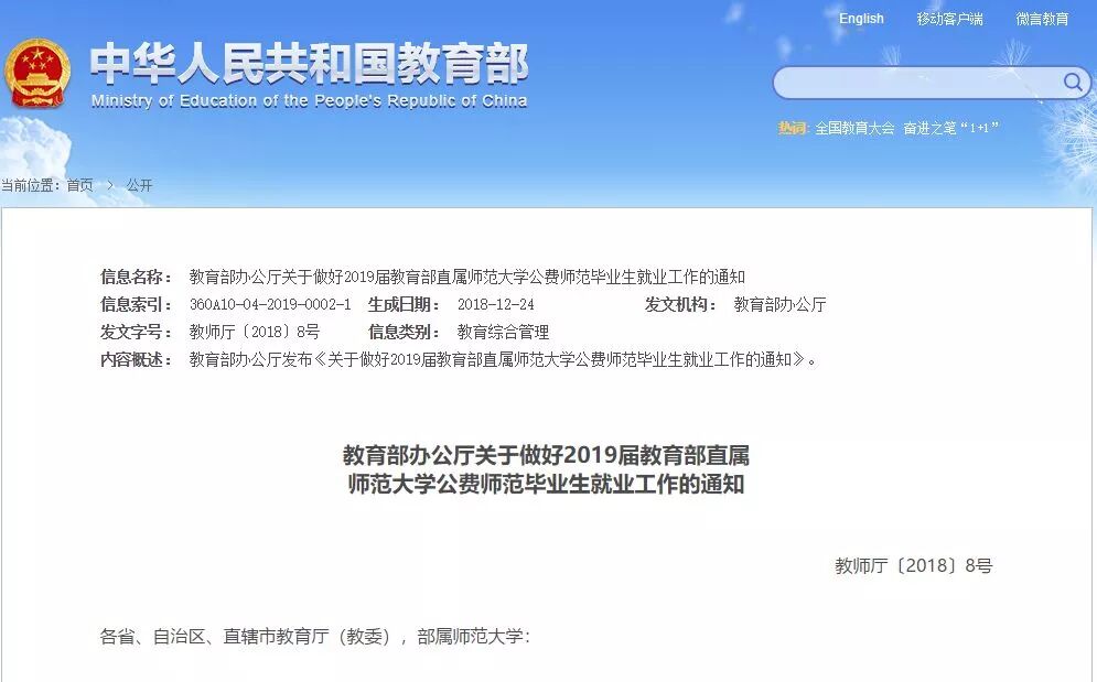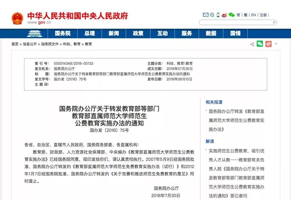 2018年8月,国务院办公厅印发通知,转发教育部等部门《教育部直属师范大学师范生公费教育实施办法》(国办发〔2018〕75号,以下简称《办法》),自印发之日起施行。
