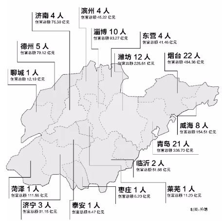 从各地区上榜创富企业家的创富总额来看,烟台地区以484.38亿元的财富市值总额位居首位,青岛、潍坊以338.70亿元、226.61亿元的创富总额位居第二位、第三位。淄博列在威海、菏泽、济宁之后,名列全省创富榜第七位。