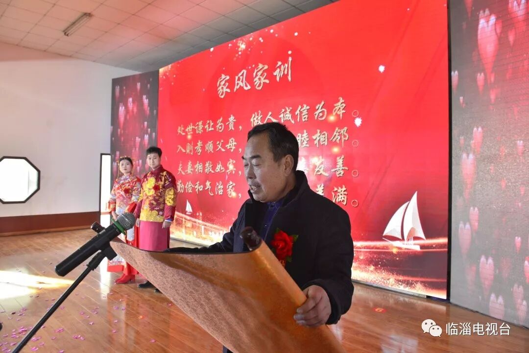 与传统婚礼不同的是,本次婚礼上,家族代表领读了家风家训,道德模范进行了赠言,两位新人做了婚姻承诺,整场婚礼文明节俭、暖心浪漫,旨在传承家庭美德、倡树文明新风。