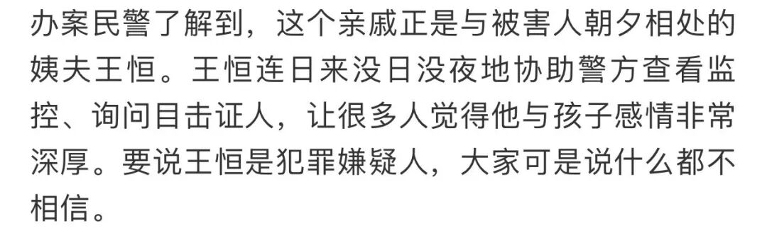 据其交待,2016年5月12日下午,他像往常一样将张煜涵送回家,并准备走时,张煜涵偷偷跑出门,并坐上了他的电动车,想去见见小表妹。此时远处有3个玩耍的小学生。王恒用雨衣盖着张煜涵带走,碰到张煜涵母亲时,还特意打了个招呼。