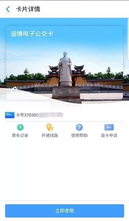 申请成功后, 在淄博电子公交卡主页面上标注着一串16位的卡号,其下方有“乘车记录”“开通线路”“使用帮助”“退卡申请”四个选项,这时用户点击手机屏幕最下方的“立即使用”,瞬间显现一个二维码,乘客上公交车,刷该二维码支付乘车费。这个二维码是实时变化的,用户可随时点击二维码就能刷新,显现新的二维码。
