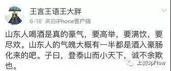 “山东劝酒的水准达到了一种艺术的高度,浸染着一股善良的霸气。其敬酒每一杯都有每一杯的说法,每一种说法都有一套论证,让人觉得不满饮此杯,简直枉披人皮矣。”