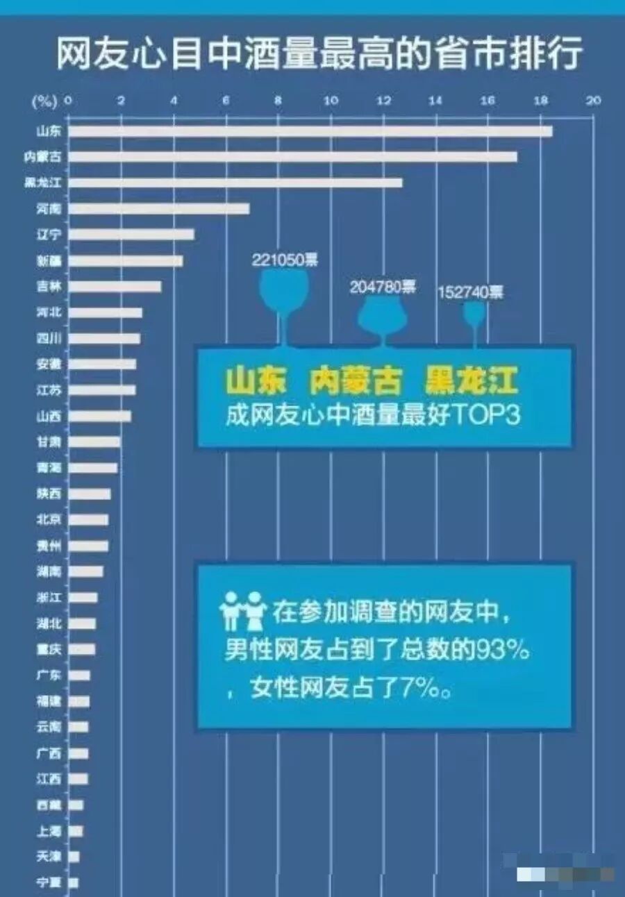 不知道大家看了这个排行服不服气,其实对于哪里的人最能喝,网友心里有自己的判断,不过山东人民夺得头筹的呼声是没跑了: