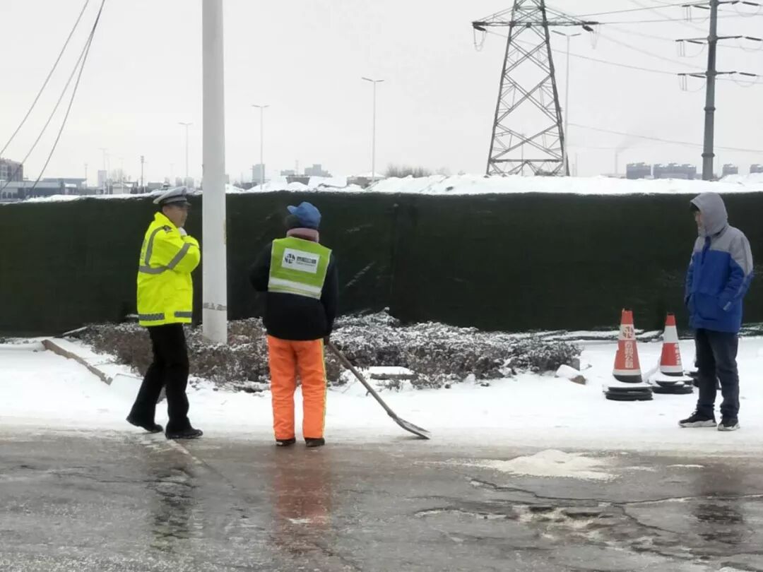 △昌国路与原山大道立交桥施工绕行路周村方向因道路湿滑大货车无法起步,造成道路拥堵,工作人员正在往道路上撒盐。
