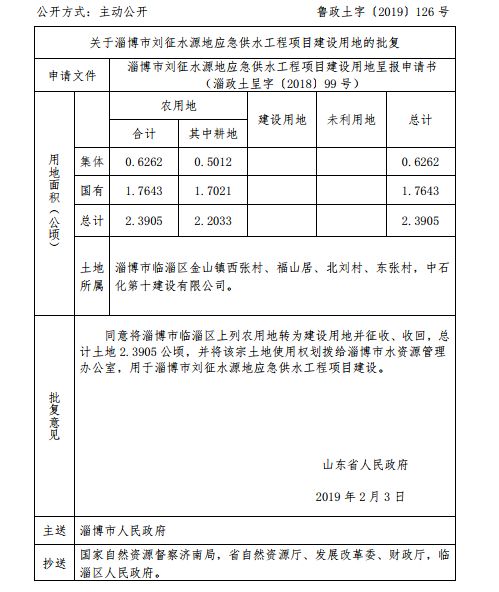 批复意见:同意将淄博市临淄区上列农用地转为建设用地并征收、收回,总计土地2.3905公顷,并将该宗土地使用权划拨给淄博市水资源管理办公室,用于淄博市刘征水源地应急供水工程项目建设。
