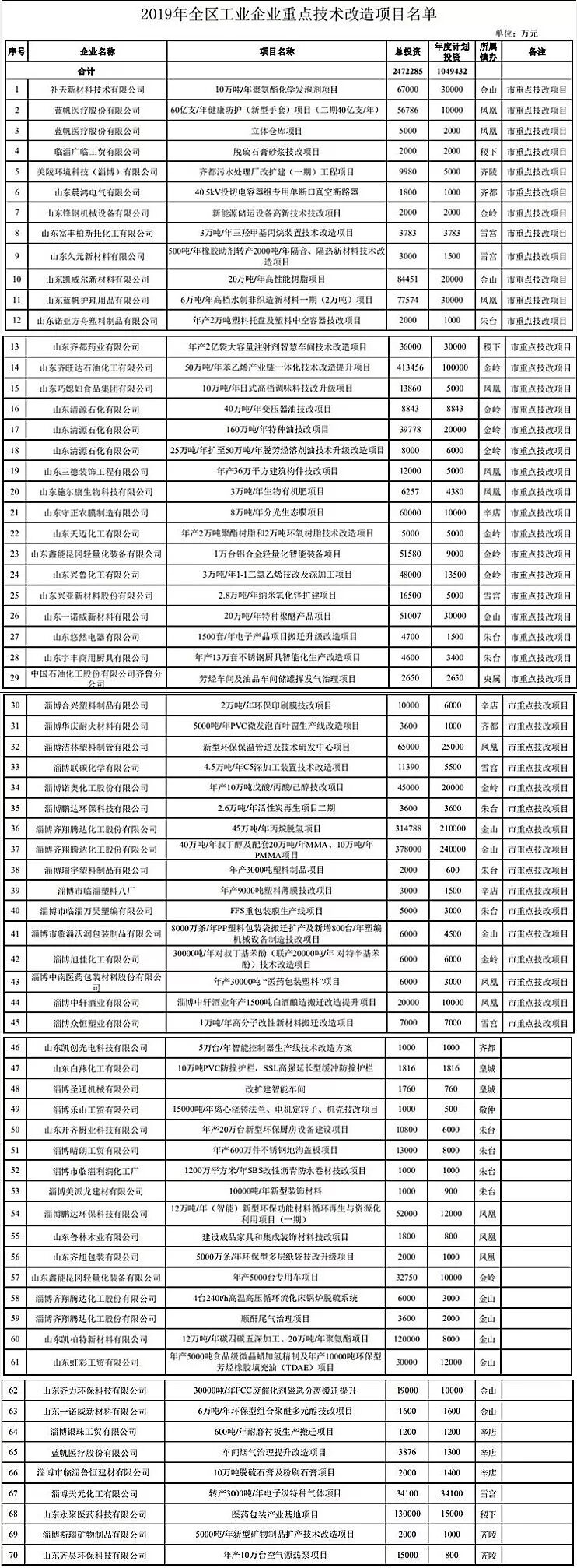 为深入贯彻落实习近平新时代中国特色社会主义思想和党的十九大精神,加快传统产业技术改造,实现工业新旧动能转换,推动工业转型升级,经区委、区政府研究,确定了2019年度全区重点技术改造项目名单。