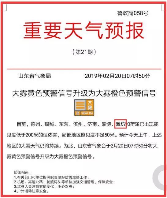 山东气象台将大雾黄色预警信号升级为大雾橙色预警信号