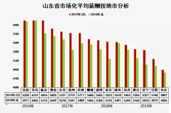 就当前最新数据来看,目前已有11个城市的平均薪酬破5500元。济南则成功超越青岛,位列全省第一达到了6250元;青岛以6219元的薪酬位列第二,临沂市后来居上排名位列全省第三,达到了6016元,成为第三个加入“6K月薪俱乐部”的城市。潍坊、东营、德州、滨州四市薪酬位列省内第二梯队,薪酬在5700元左右。