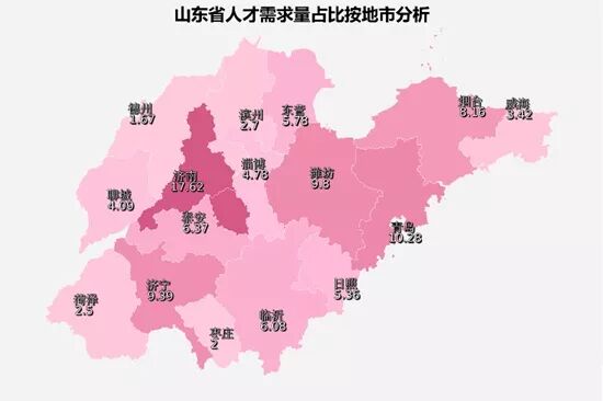 上图为当前山东各地市人才需求量占比,16地市人才需求量占比大致分为四个梯队,济南、青岛属第一梯队,独立雇主数占比分别为17.62%和10.28%,包揽山东省近三分之一的人才需求,成为人才需求的主要聚集地;潍坊、济宁、烟台属第二梯队,人才需求量占比均在8%以上;泰安、东营、临沂、日照属第三梯队,人才需求量占比均在5%以上;其他城市属于第四梯队,人才需求量占比占比在4%左右。