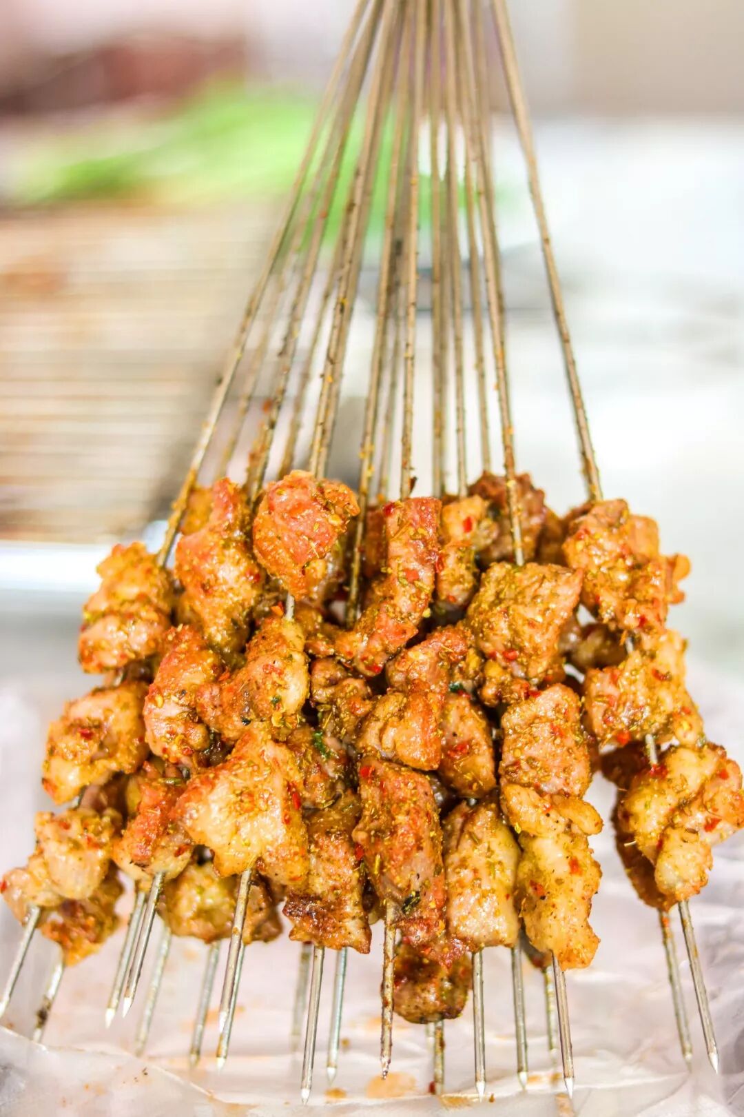 羊肉串上炉先烤上十秒钟翻面刷油撒盐