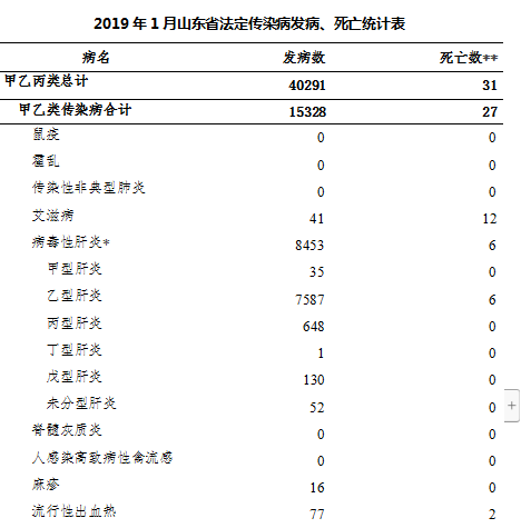 昨日,山东省卫生健康委员会发布山东省2019年1月法定报告传染病疫情通报。2019年1月(2019年1月1日0时至1月31日24时),山东省无甲类传染病发病、死亡报告,共报告法定传染病40291例,死亡31人。