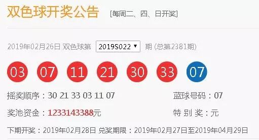 昨晚(2月26日),福彩双色球第2019022期开奖,当期红球开出03、07、11、21、30、33,蓝球开出遗漏10期的奇数07。