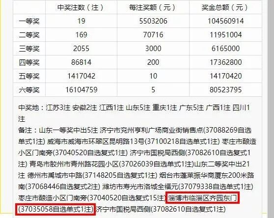 据检索,当期山东收获的5注一等奖分别被济宁、威海、枣庄和青岛的幸运彩友收获。