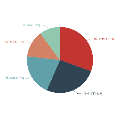 面积方面,90-110平面积区间占据首位,搜索占比为17.48%;110-130平面积区间的搜索占比为14.9%,位居第二; 70-90平面积区间搜索占比为11.59%,位居第三位。