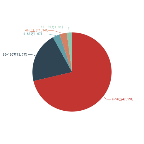 价格方面,0-50万价格区间更被网友关注,占比达47.59%;其后为80-100万价格区间,占比13.77%;0-80万价格区间搜索占比为1.97%,位居第三位。