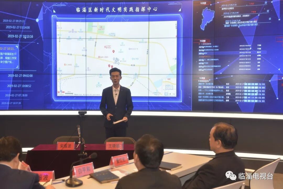 临淄融媒体中心工作人员现场演示并介绍指挥调度中心功能。