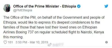3月10日,埃塞俄比亚航空公司一架波音737MAX客机在飞往肯尼亚途中坠毁。这也是近五个月来第二架波音737MAX客机坠毁。机上搭乘149名乘客和8名机组成员,全部遇难。