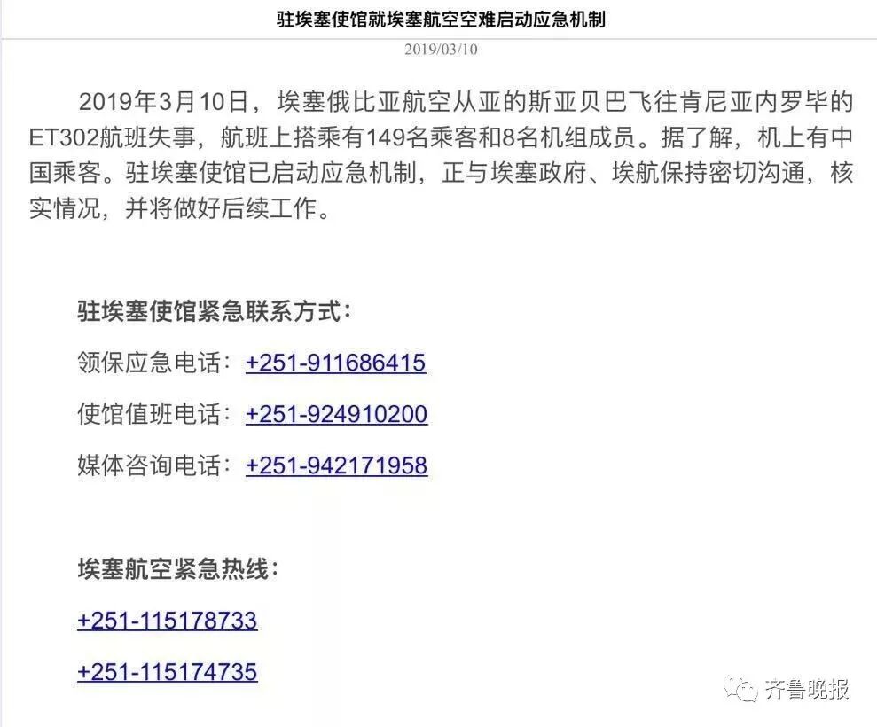使馆正在确认航班旅客名单中的细节,已启动应急机制,与有关各方保持密切沟通,积极开展后续工作,包括一方面与政府、航空公司保持联络,一方面陆续与家属取得联系,提供必要的协助,如签证、出入境方面,协调与相关部门的手续。同时,埃塞俄比亚航空也承诺会第一时间主动联系家属,处理相关事宜。
