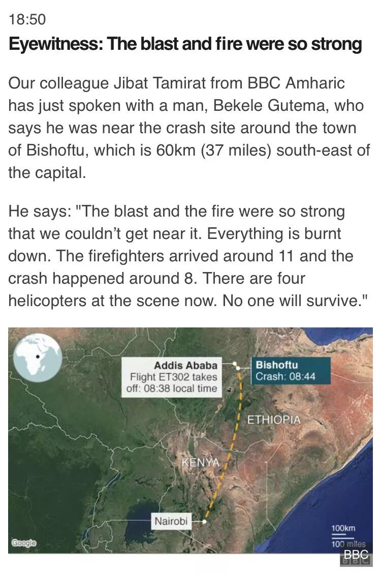 据报道,附近的目击者贝克莱·古特马说:“爆炸和大火是如此强烈,我们无法接近它。所有东西都烧毁了。消防员在11点左右到达,坠机发生在8点多。现在有四架直升机在现场。没有人能活下来。”