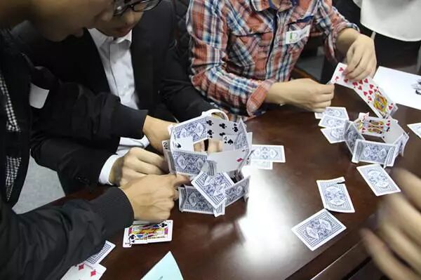 项目介绍:各队在45分钟内,用纸牌搭建一座纸塔,越新颖越好。要求:1、此项目是竞技性的比赛;2、要求越高越好、还要立得稳;3、各小组相互探听对方的方案;4、各组可以利用的资源只有一幅纸牌。5、在纸塔搭建完成后分发给各队一张白纸,请各队自己折一个纸飞机作为攻打对方纸塔的武器;每位学员只有一次攻打对方纸塔的机会。