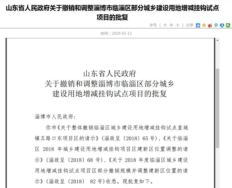 3月14日,山东省自然资源厅网站发布了省政府关于撤销和调整淄博市临淄区部分城乡建设用地增减挂钩试点项目的批复,同意一大批土地转为建设用地!