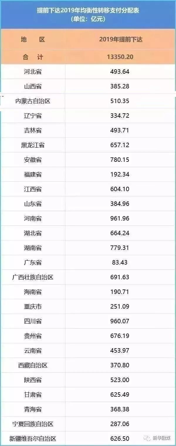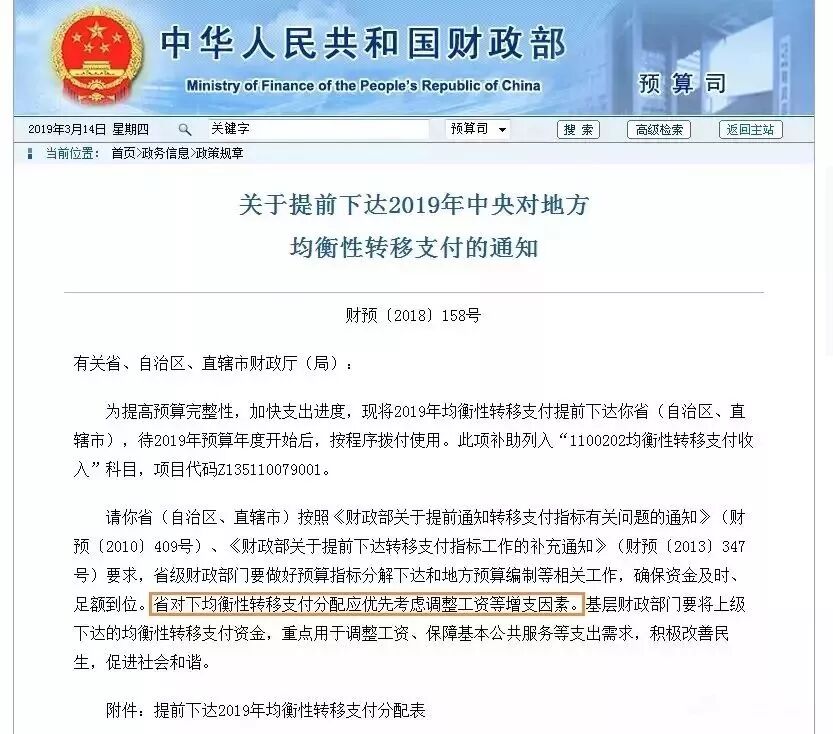 2018年年底,国家财政部发布了一条通知——《关于提前下达2019年中央对地方均衡性转移支付的通知》,在该通知中,明确指出:应优先考虑调整工资等增支因素!2019年均衡性转移支付13350.2亿元资金,分配给内蒙古、山东、四川、湖南、广西等26个省份。